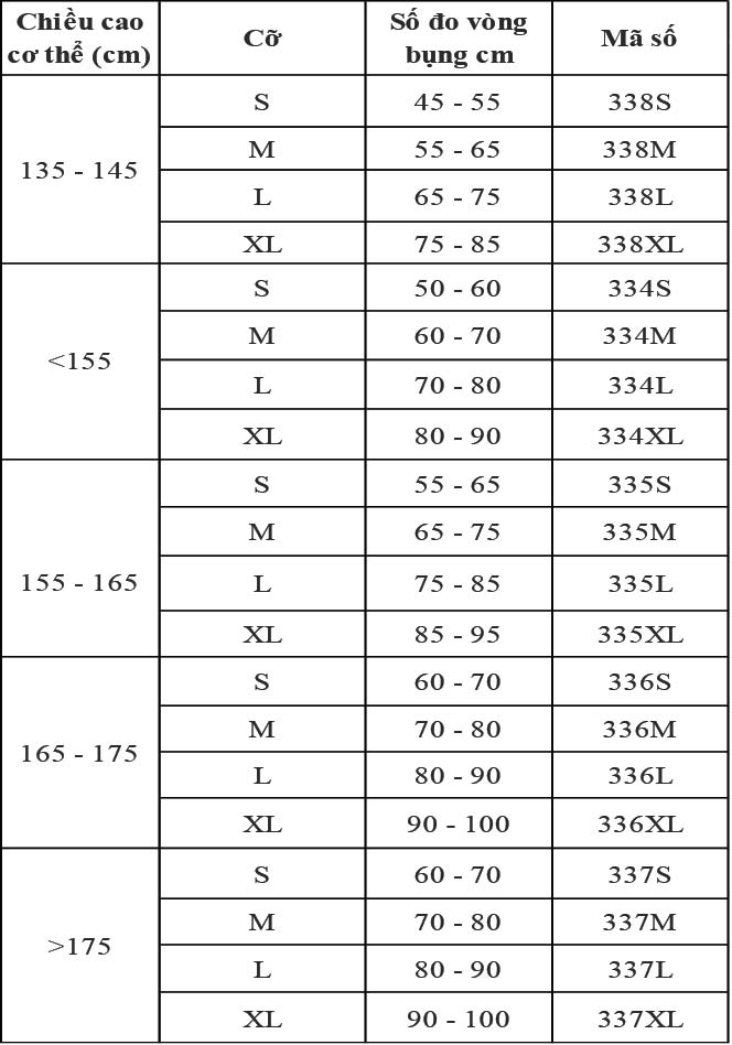 – Lựa chọn sản phẩm theo chiều cao cơ thể và vòng bụng.